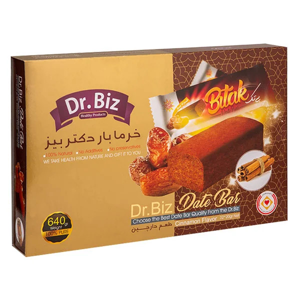 خرمابار دارچینی دکتر بیز، یک کیک خرمایی انرژی زا، طبیعی، بدون شکر و حاوی خرما طبیعی و دارچین می باشد. شیرینی این محصول به صورت طبیعی از میوه خرما است. در تولید خرما بار دارچینی دکتر بیز از خرمای درجه یک استفاده می شود. کیفیت خرمای ورودی ابتدا توسط دستگاه های تمام اتوماتیک اروپایی کنترل شده و پس از تایید کیفیت، فرآیند ضدعفونی، پاستوریزاسیون، فرآوری و بسته بندی صورت می گیرد.